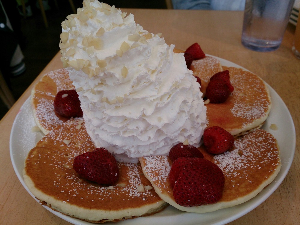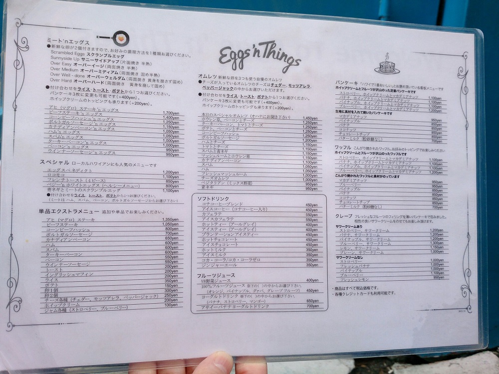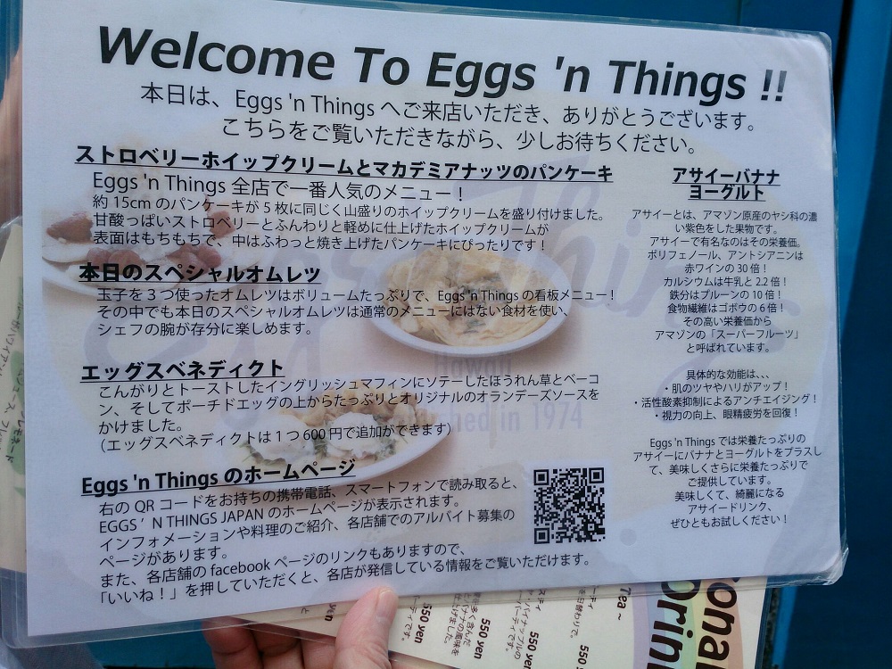 このなかから、目玉商品らしい「ストロベリーホイップクリームとマカデミアナッツのパンケーキ」と「本日のオムレツ」・・・ほうれん草とベーコンだったかなぁ。を1 個ずつチョイス。