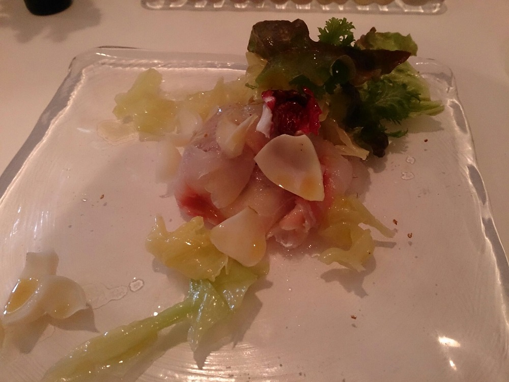 前菜仕立てのサラダより、『真鯛のカルパッチョ・地物キャベツとユリ根のサラダ』。