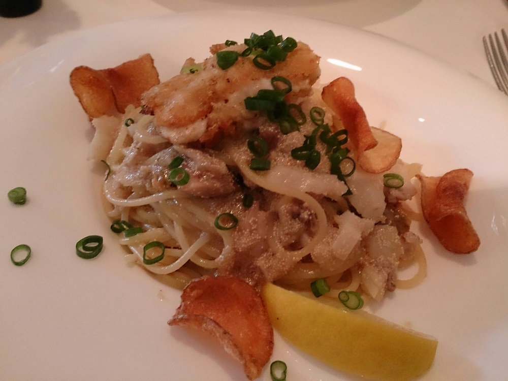 『寒鱈をすべて使ったスパゲッティ(頭と骨のブイヨン)じゃがいもの組み合わせ』。